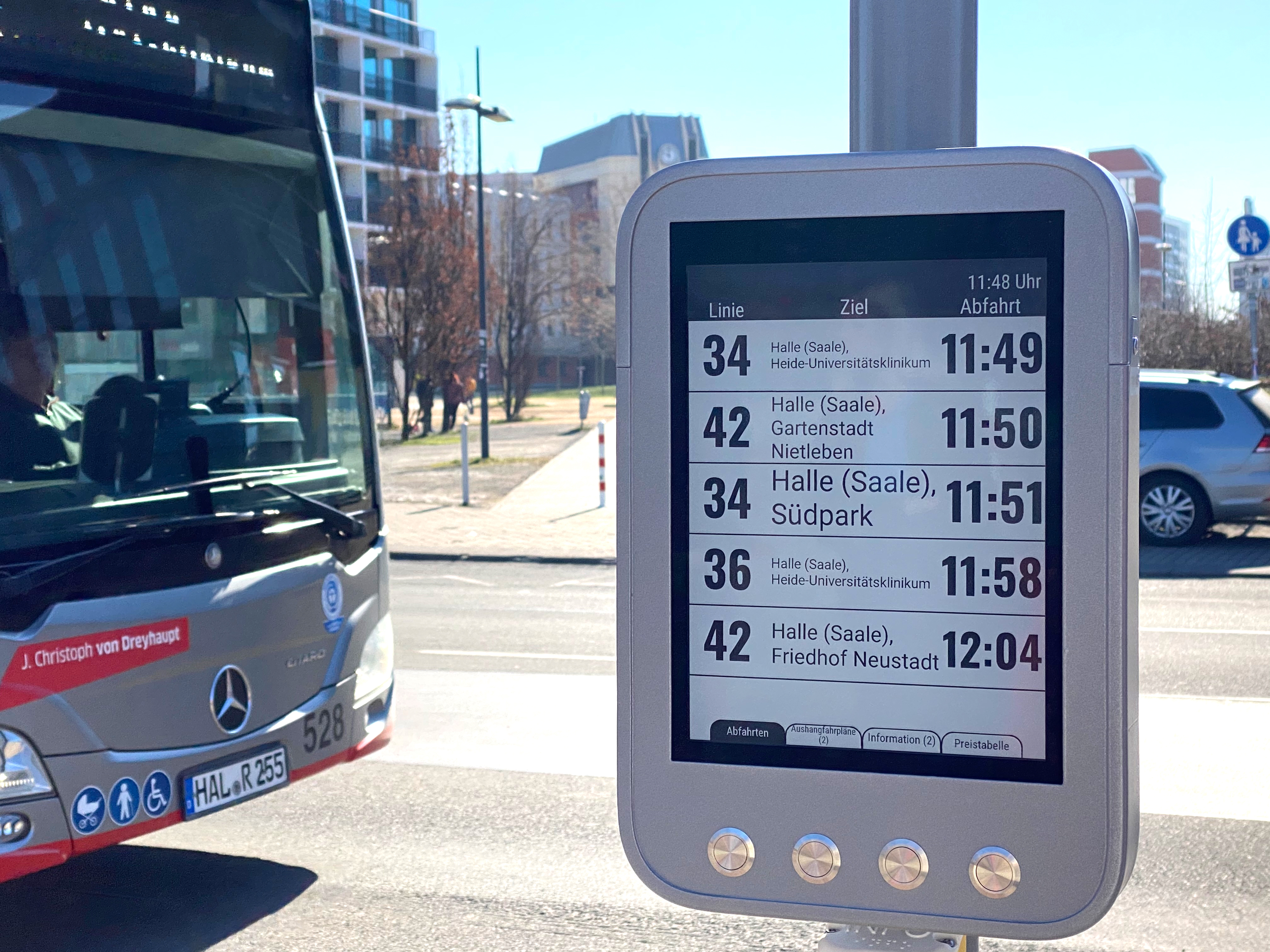An den Bushaltestellen „Einkaufspark HEP“ und "Am Bruchsee" in Halle-Neustadt können Fahrgäste künftig die neuen E-Paper testen. Sie zeigen neben Liniennetzplänen und Tarifinformationen auch dynamische Fahrplaninformationen wie Abfahrtszeiten aller Linien der jeweiligen Haltestelle in Echtzeit. So können über die Leitstelle der HAVAG jederzeit auch Abfahrtszeiten und Fahrplanänderungen unkompliziert angepasst werden. Auch Baustelleninformationen, verbunden mit aktuellen Umleitungen, können so schnell übermittelt werden. Blinden und Sehbehinderten beispielsweise steht eine Vorlesefunktion per Knopfdruck zur Verfügung, die die aktuellen Abfahrten der jeweiligen Haltestelle ansagt.