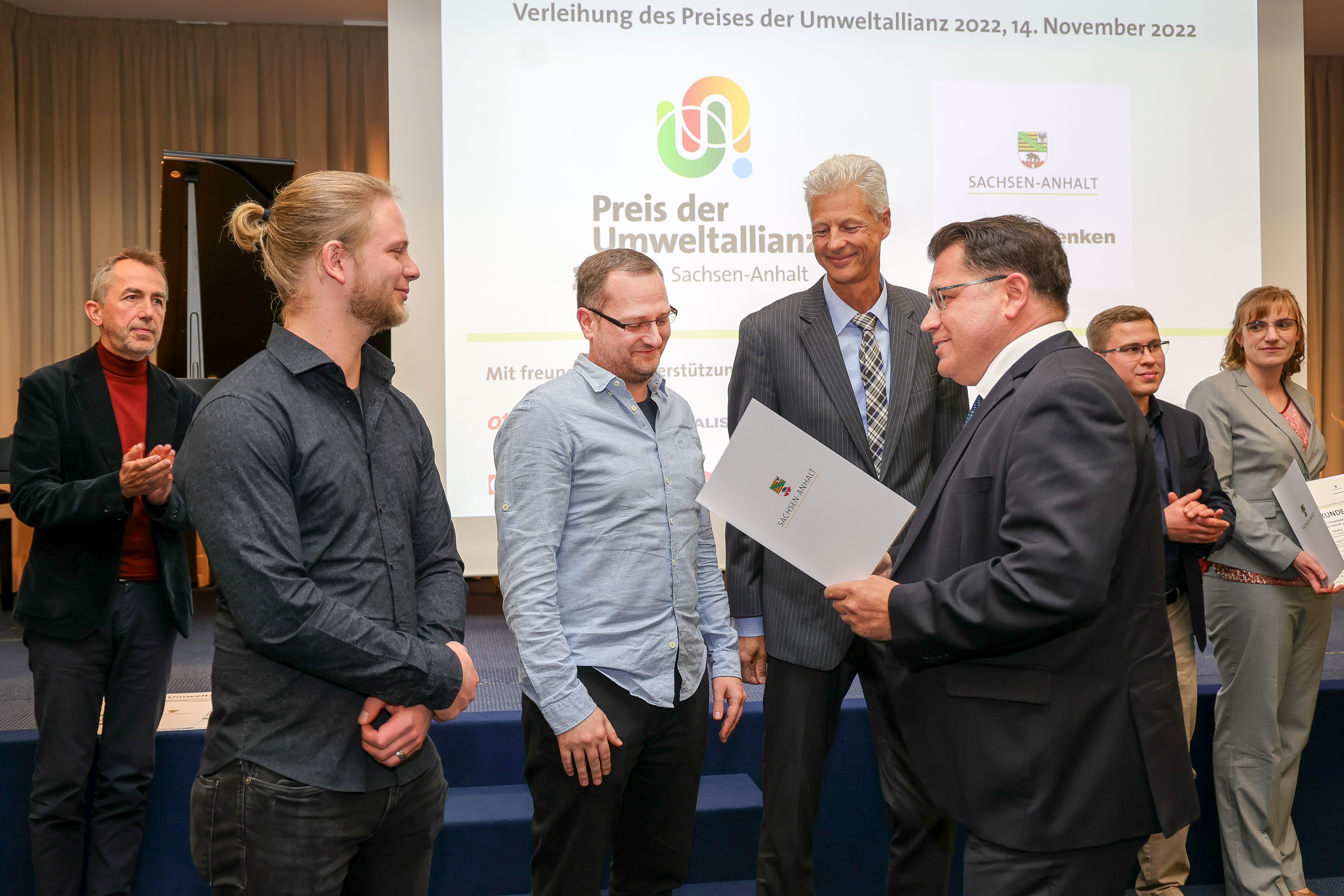 Die Hallesche Wasser und Stadtwirtschaft GmbH (HWS), ein Unternehmen der Stadtwerke Halle-Gruppe, wurde Ende vergangenen Jahres als Finalist beim 8. Preis der Umweltallianz Sachsen-Anhalt 2022 in der Kategorie „Klima- und ressourcenschonende Unternehmensführung“ ausgezeichnet. Der Wettbewerb stand unter dem Motto „Klima- und Ressourcenschutz als wirtschaftlicher Erfolgsfaktor“. Die HWS hatte das Großprojekt „Energieautarke Kläranlage“ eingereicht und kam damit ins Finale - unter die Top 3 Unternehmen in Sachsen-Anhalt. Als Projektverantwortliche des Bereichs Abwasser nahm Abteilungsleiter Dankert Richter gemeinsam mit seinen Mitarbeitern Stefan Ströhl und Daniel Roos die Urkunde entgegen. Im Rahmen des Wettbewerbs entstand für die Finalisten ein professionell produzierter Kurzfilm, in dem die HWS ihr Großprojekt vorstellt. Sie finden ihn auf dem Youtube-Kanal der Stadtwerke Halle-Gruppe.