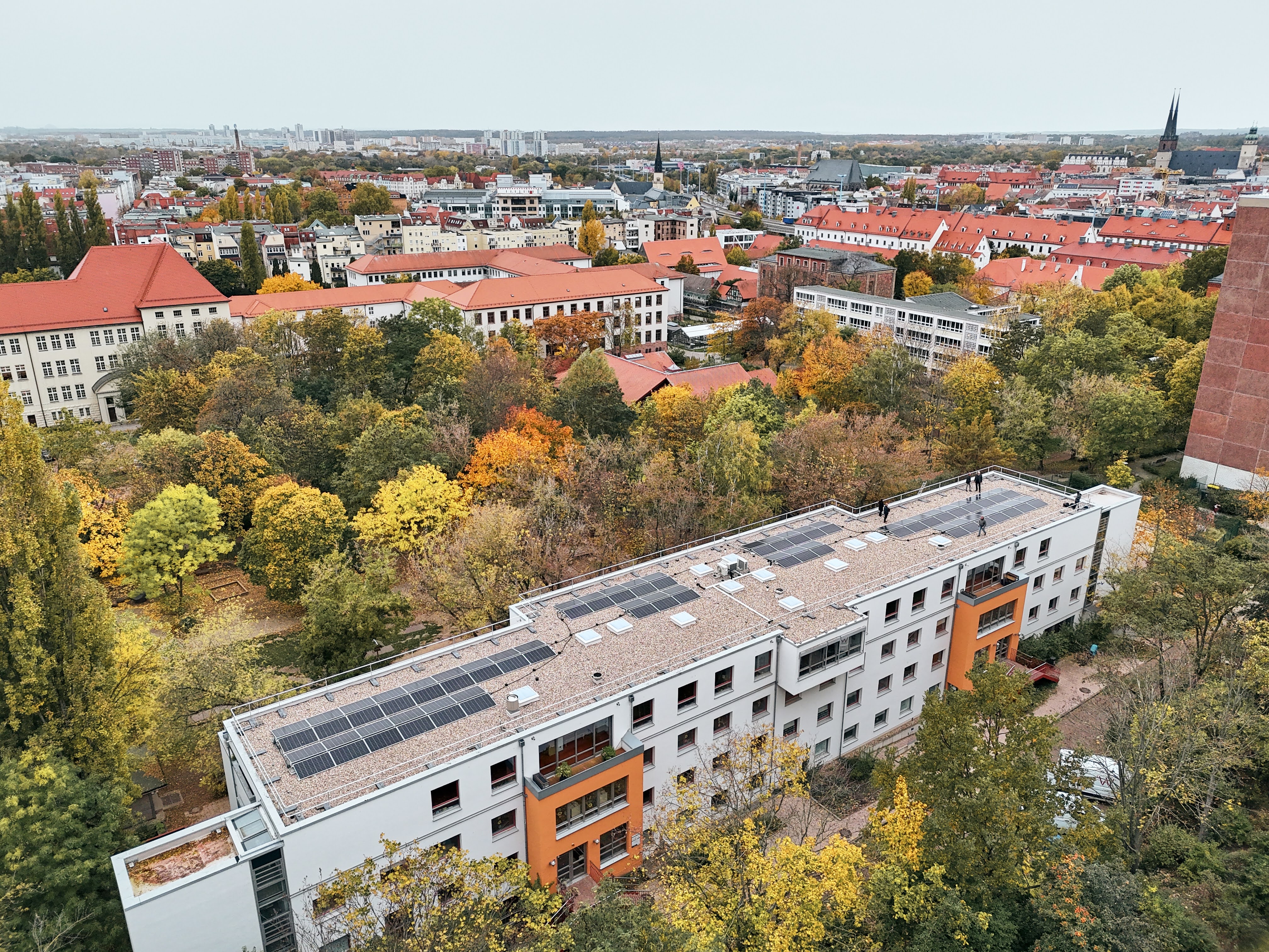 „Schulen, Kindergärten und ähnliche Gebäude verfügen über kostbare Dachflächen, die für die Stromerzeugung durch Photovoltaik (PV) genutzt werden können. Wir haben über 300 städtische Dächer gescreent und auf ihre Tauglichkeit für PV-Anlagen bewertet. Dabei sind viele Parameter, allen voran die Statik, zu beachten. Kürzlich haben wir das erste Dach im Rahmen des Programms ‚Solar auf halleschen Dächern‘ umgesetzt und errichteten eine PV-Anlage für die Franckeschen Stiftungen in der Voßstraße 12 (Montessori Kinderhaus, Kita Amos Comenius, Hort August Hermann Francke). Die Anlage wird von der EVH betrieben und der Strom wird direkt von den Stiftungen abgenommen“, so Ole Baumann, Projektentwickler für Energiedienstleistungen der EVH GmbH.