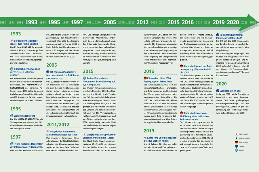 Die Stadt Halle (Saale) dokumentierte am 16.12.2015 ihren klimapolitischen Willen, indem durch einen Ratsbeschluss das ENERGIE- UND KLIMAPOLITISCHE LEITBILD verbindlich verabschiedet wurde. Das Leitbild sieht unter anderem die Senkung der CO2-Emissionen, eine sozial, ökonomisch und ökologisch verträgliche Gestaltung und Anpassung an den Klimawandel, eine kontinuierliche Steigerung der Energieeffizienz sowie Maßnahmen zum nachhaltigen Umgang mit Ressourcen vor.